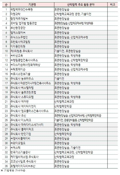 이번 산학협력 우수기관 선정 공모에 총 44개 기관이 신청하였으며, 산학협력 활동성과 및 계획에 대한 평가결과를 바탕으로 ‘산학협력 마일리지 운영협의체’ 심의를 거쳐 최종 35개 기관을 선정하였다. 선정된 기관은 ‘산학협력 마일리지 누리집'에서 산학협력 우수기관 인증서를 발급받을 수 있으며, 산학협력 우수기관임을 인증하는 현판도 제공된다.