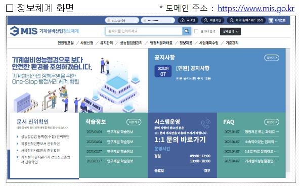 기계설비산업 정보체계는 건축물에 설치된 냉·난방, 환기설비, 위생설비 등 기계설비에 대한 정보 및 자료를 체계적으로 수집하고 효과적으로 관리하기 위해 국토교통부가 구축한 통합 플랫폼으로서,플랫폼 내 행정업무 시스템과 민원웹포털 등을 구축하여 지자체 업무 담당자가 기계설비공사와 관련된 인·허가 등 행정업무를 종합적으로 처리할 수 있도록 지원하고, 국민들에게 성능점검업체 등록 현황 등 기계설비산업 관련 통계자료도 제공하게 된다.