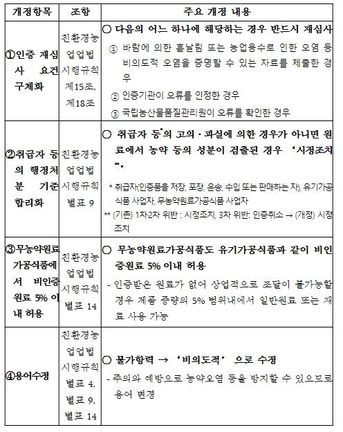 생산과정상 원인으로 인증품에서 합성 농약 성분이 검출되거나 동물용의약품 성분이 허용기준의 10분의 1을 초과하여 검출된 경우, 선의의 취급자를 ‘인증취소’까지 하는 것은 과도하다는 지적이 있어 시정조치가 이행되면 취급자가 인증을 유지할 수 있도록 개정했다.