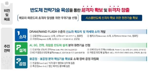 '반도체 미래기술 로드맵'은 ▲ 신소자 메모리 및 차세대 소자 개발(10개), ▲ 인공지능(AI), 6세대(6G), 전력, 차량용 반도체 설계 원천기술 개발(24개), ▲ 초미세화 및 첨단 패키징을 위한 공정 원천기술 개발(11개)을 위한 10년 미래핵심기술 확보 계획으로, 향후 우리나라가 반도체 우위기술 분야 초격차를 유지하고, 시스템반도체 분야에선 신격차를 확보할 수 있는 길라잡이 역할을 할 예정이다.