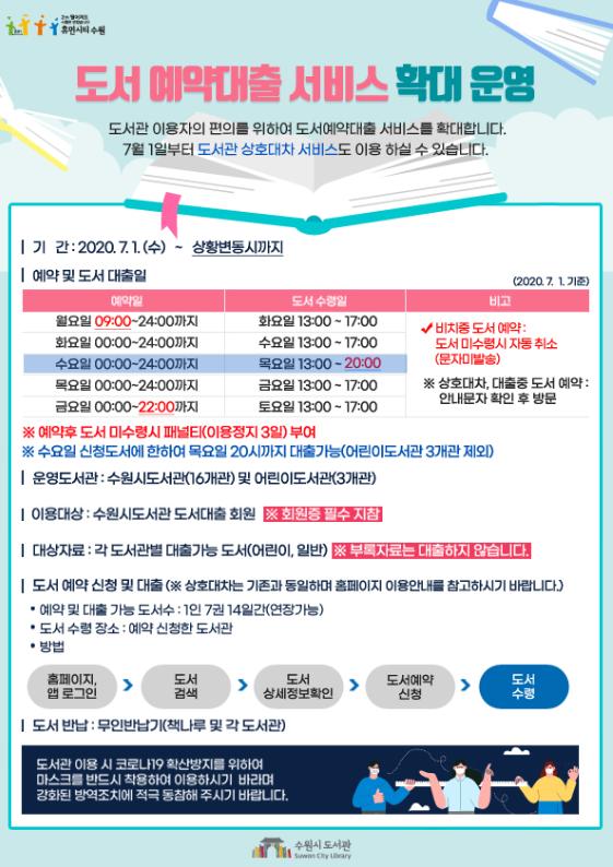 [KNT한국뉴스타임] 코로나19 확산으로 휴관 중인 수원시 공공도서관이 ‘도서예약대출 서비스’를 확대하고, 상호대차서비스를 재개한다.