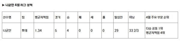4월 롯데가 단독 1위에 오른 것은 나균안의 활약이 없었더라면 불가능했다. 5경기 4승(공동 1위), 평균자책점 1.34(4위)을 기록했을 뿐만 아니라 33 2/3이닝으로 평균 6이닝 이상을 소화하며 선발 투수로서의 역할을 충실히 해주었다. 또한 나균안이 선발 등판한 경기에서 롯데는 5경기 전승을 기록하며 팀의 승리를 부르는 ‘행운의 상징’이 되기도 했다.