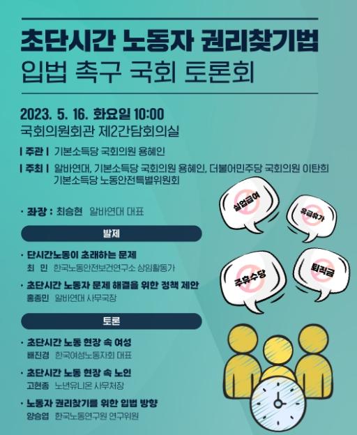 [한국뉴스타임=편집국] 5월 16일 오전 10시 국회의원회관 제2간담회의실에서 알바연대, 기본소득당 국회의원 용혜인, 더불어민주당 국회의원 이탄희, 기본소득당 노동안전특별위원회가 '초단시간 노동자 권리찾기법 입법 촉구 국회 토론회'를 개최한다. 토론회의 주관은 용혜인 국회의원이 맡았다.