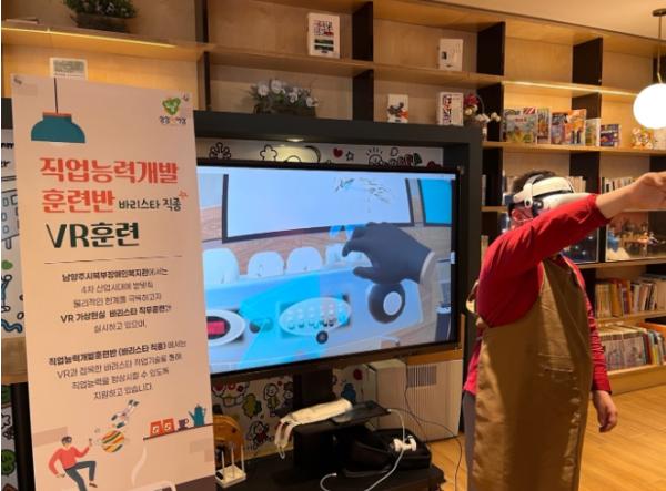 남양주시북부장애인복지관은 지난 2월부터 총 8명의 훈련생에게 바리스타 1급 자격증 이론 강의와 라테 아트 실기 훈련 등 전문 교육을 제공하고 있으며, 이번 훈련은 VR 기기를 활용해 가상 현실에서 커피 및 음료 제조 방법, 손님 응대 방법, 커피 머신 청소 방법 등을 배울 수 있도록 마련됐다.
