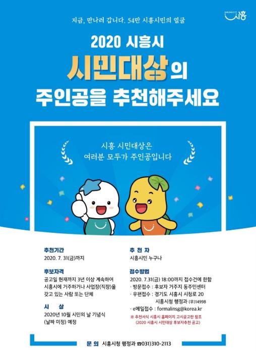 시흥시(시장 임병택)는 내달 7월 31일까지 2020 시흥시 시민대상 후보자를 시흥시민에게 추천받는다.