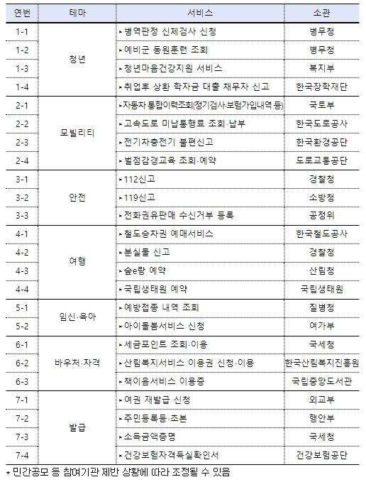 국민 입장에서 서비스를 관련 민간앱에서 한 번에 해결할 수 있도록 청년, 모빌리티, 안전, 여행, 임신?육아, 바우처?자격, 발급 등 7개 분야(테마)를 선정했으며 주요 내용은 아래와 같다.