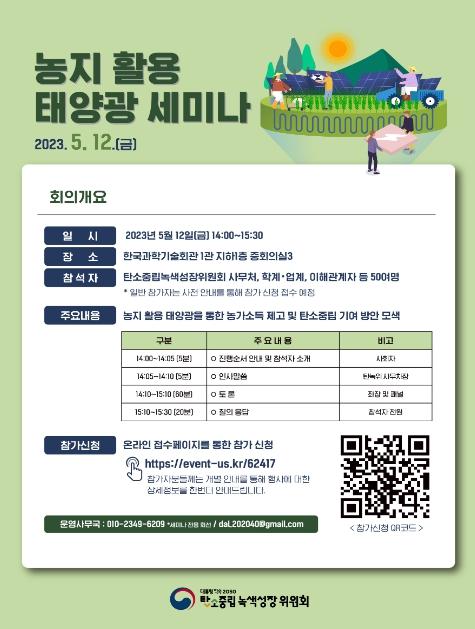 세미나에는 학계, 업계, 연구기관, 농업인 단체 등 전문가들이 참석하여 농지를 활용한 태양광 보급 시 애로사항과 문제점, 제도 및 관리 등의 개선 방안에 대해 토론할 계획이다.