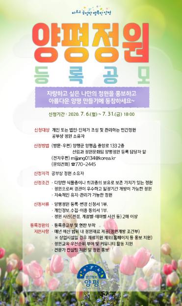 양평군은 지난 6월 22일 「양평군 정원문화 확산 및 진흥에 관한 조례」제정한데 이어, 관내 개인, 단체, 법인 등이 조성하여 관리하는 민간정원을 대상으로 우수한 정원을 발굴·개방하도록 하는 “양평 정원” 등록제를 추진한다고 밝혔다.
