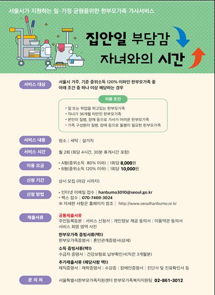 서울시는 일?양육?가사를 혼자 병행해야 하는 한부모가족의 시간빈곤을 해소하고 워라밸을 실현하고자 2018년부터 가사서비스를 지원하고 있다.