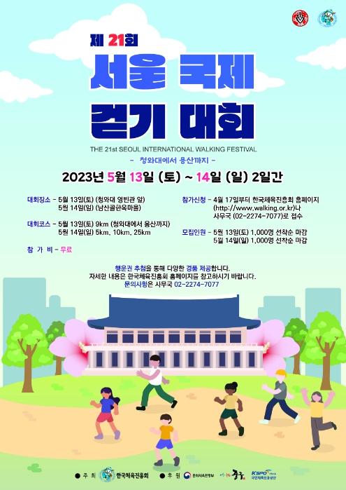 [한국뉴스타임=편집국] 청와대 개방과 용산시대 개막 1주년을 기념해 천 명의 시민이 청와대에서 최근 새롭게 개방된 용산어린이정원까지 함께 걷는다. 문화체육관광부가 후원하고 (사)한국체육진흥회가 주최하는 ‘제21회 서울국제걷기대회’는 5월 13일 코스를 청와대에서 시작해 용산어린이정원에 도착하는 코스로 운영한다.