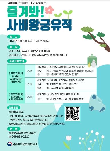 먼저, 5월 12일부터 12월 29일까지 주중에는 2개의 프로그램으로 구성된 ‘즐겨봐! 사비왕궁유적’이 하루 3회(오전 10시, 오후 1시, 오후 3시)에 걸쳐 90분간 운영된다.