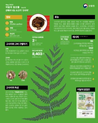 5월 이달의 임산물은 ‘고사리’다. 영양소가 풍부해 산에서 나는 소고기라 불리는 고사리는 양치식물로 높이가 1m 정도 자란다. 줄기는 통통하고 아기가 손을 꼭 쥐고 있는 것처럼 말려있는 것이 특징이다.