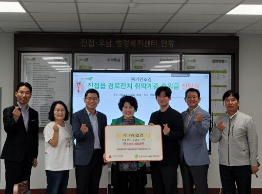[한국뉴스타임=편집국] 남양주시 진접오남행정복지센터는 12일 ㈜가인조경에서 진접읍 사회단체협의회에 경로잔치를 위한 후원금 100만 원을 전달했다고 밝혔다.