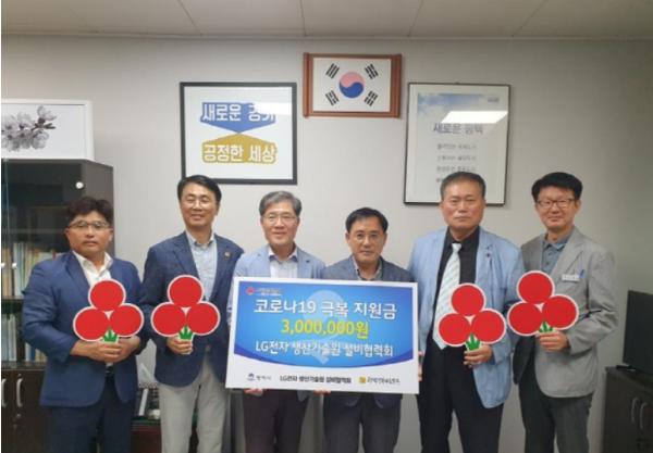[KNT한국뉴스타임] LG전자 생산기술원 설비협력회(회장 정윤수)는 지난 30일 평택시에 지역사회 코로나19 감염 및 확산 방지와 피해지원을 위해 300만원을 기탁했다.