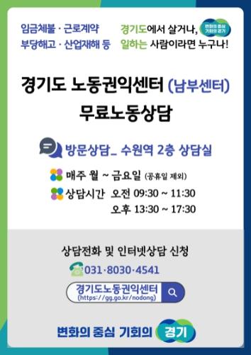 [한국뉴스타임=편집국] 경기도는 일하는 사람들을 위한 무료 노동 상담 공간인 경기도노동권익센터 남부센터를 운영한다고 14일 밝혔다.