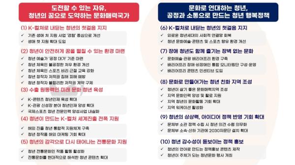 청년 예술가 공정대가 기준 수립, 문화기반시설 장애인 이용 개선 방안 마련, 정책 수립 시 청년 의견 수렴 의무화 등 ‘청년문화정책 10대 과제’ 세부 과제 선정
