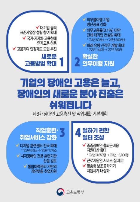 장애인 고용저조 부문의 확실한 고용의무 준수를 위해 의무불이행 기업에 대한 명단공표 기준을 강화하고(’23), ’25년까지 의무고용률(3.1%)미만인 500인 이상 기업에 고용컨설팅 제공과 적합직무 보급도 확대할 계획이다.