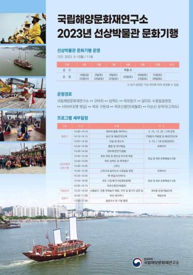 [한국뉴스타임=편집국] 문화재청 국립해양문화재연구소(소장 김성배)는 5월부터 10월까지 총 11회에 걸쳐 목포 바다 위에서 펼쳐지는 ‘선상박물관 문화기행’을 운영하기로 하고, 오는 19일 국민과 함께 이번 행사의 시작을 알리는 출항식을 개최한다.