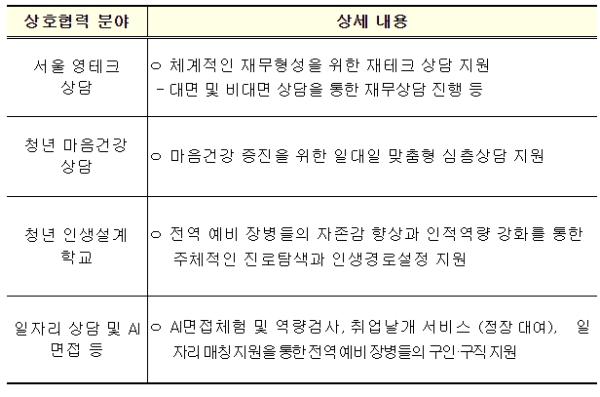 협약에 따라 양 기관은 서울시 청년정책 중 국군 장병에게 적용이 가능한 맞춤형 재무상담, 취·창업 지원, 마음 건강증진을 위한 일대일 심층 상담 지원 등을 우선적으로 추진할 계획이다.