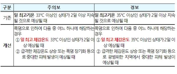 이를 위해 기상청은 지난 2020년부터 3년 동안 체감온도 기반 폭염특보를 시범 운영하여 행정안전부, 지방자치단체 등 관계기관과 소통하면서 더욱 실효성 있는 제도를 마련하기 위해 긴밀히 협의해 왔다. 특히 방재 기관과의 협력을 통해 세부적인 산출방법을 개선했고, 2021년 발표된 신(新)기후평년값을 추가로 고려함으로써 기후변화에 따른 환경 변화도 반영했다.