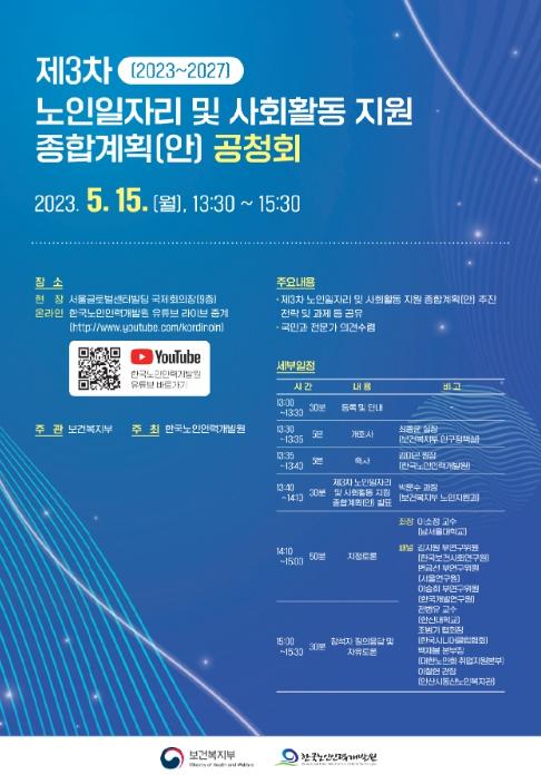 [한국뉴스타임=편집국] 보건복지부와 한국노인인력개발원(원장 김미곤)은 5월 15일 오후 1시 30분 서울글로벌센터(서울시 종로구)에서 ‘제3차 노인일자리 및 사회활동 지원 종합계획(이하 종합계획)’수립을 위한 공청회를 개최했다.