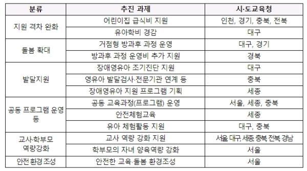 선도교육청은 지역의 자원을 활용하여 유치원·어린이집 간 교육·돌봄 격차를 완화하고 교육의 질을 높이기 위한 준비를 선제적으로 시행하게 된다. 이를 위해 선정된 9개 시도교육청은 자체 준비위원회, 자문단 및 시도 지지체와 협의체 등을 구성·운영하고, 어린이집 급식비 지원, 유치원·어린이집 공동 교육과정 운영 등 13개 과제에 총 482억 원(교육청 424억 원, 지자체 58억 원)을 지원한다.