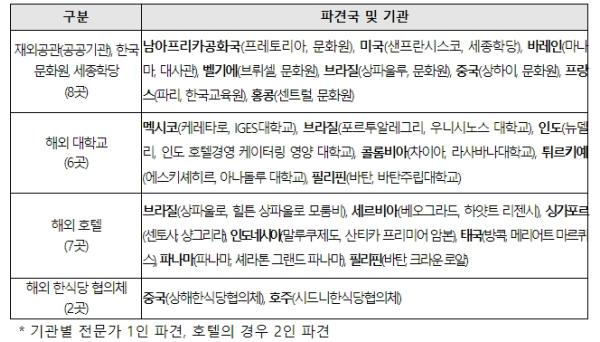 선정된 한식 전문가는 미국, 프랑스 등 8개국 재외공관 등에 8명, 튀르키예, 멕시코 등 6개국 대학교에 6명, 세르비아, 파나마 등 7개국 호텔에 14명, 중국, 호주 한식당 협의체에 2명씩 각각 배치된다.
