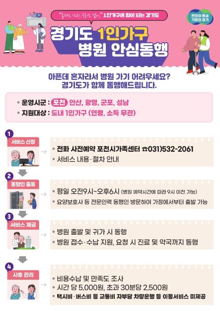 [한국뉴스타임=편집국] 포천시는 올해 4월부터 포천시가족센터를 통해 홀로 병원 가기 어려운 관내 1인가구, 유사 상황에 놓인 실질적 1인가구를 대상으로 병원 안심동행서비스를 추진하고 있다.
