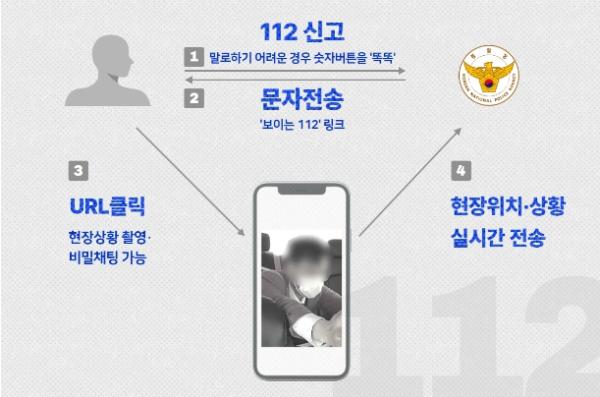 경찰청 관계자는 “112 신고 후 안내에 따라 숫자 버튼을 똑똑 누르면 ‘보이는 112’ 접속을 통해, 실시간 영상 전달, 위치확인, 비밀채팅이 가능하다는 것을 잊지 말고, 말하기 어려운 위급상황에서 적극적으로 이용해 달라.”라고 당부했다.