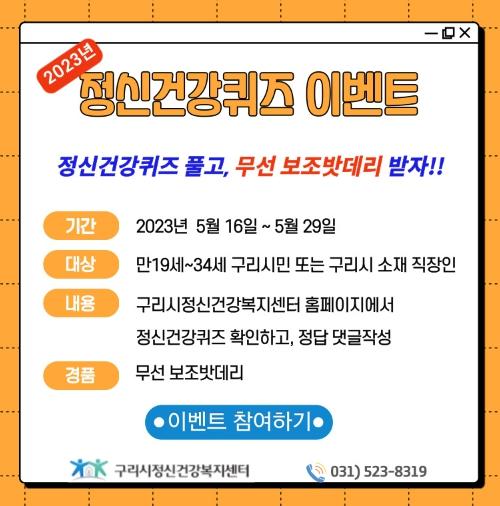 센터 관계자는 “정신건강퀴즈 이벤트를 통해 정신건강복지서비스에 대한 인지도가 향상되어 구리시민들이 더욱 손쉽게 정신건강서비스를 이용할 수 있을 것으로 기대된다.”라고 전했다.