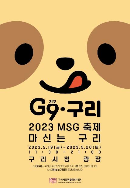 구리시상권활성화재단(이사장 백경현)은 봄꽃이 만개하는 5월, 축제 시즌을 맞아 오는 19일과 20일 양일간 오전 11시 30분부터 저녁 9시까지 구리시청 및 구리아트홀 일원에서 ‘G9(지구)·구리 2023 MSG(마신는 구리) 축제’를 개최한다.