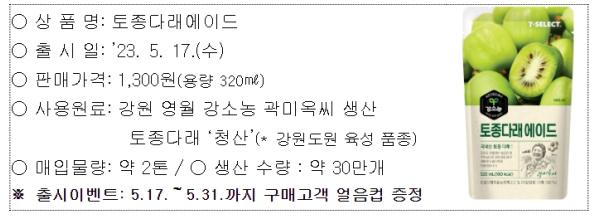 [한국뉴스타임=편집국] 농촌진흥청은 세븐일레븐, 강원도농업기술원과 함께 토종 과일 다래로 만든 편의점 음료 제품 ‘토종다래에이드’를 선보인다.