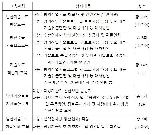 우리나라는 K-9 자주포, K2 전차를 포함하여 다양한 무기체계를 폴란드, UAE 등 세계 각국으로 수출하고 있다. 수출이 증가함에 따라 기술유출에 대한 위험성은 커질 수 밖에 없다. 이에 방위사업청은 이번 방위산업기술 보호 교육에 방산 수출 관련 직원들에 대한 기술보호 교육을 신설했다. 또한, 기술보호 책임자 교육에는 핵심기술 연구개발에 참여하는 연구원들을 포함하여 기술보호 교육을 확대 실시할 예정이다.