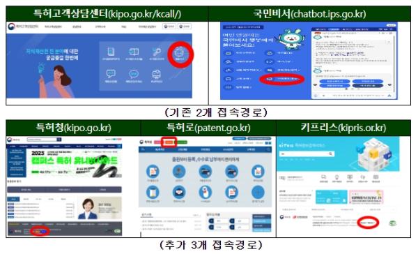?챗봇상담 서비스의 접속창구를 기존 2개(특허고객상담센터, 국민비서 누리집)에서 5개(특허청, 특허로, 키프리스 누리집 추가)로 확대하여 사용자의 접근성을 강화하고,