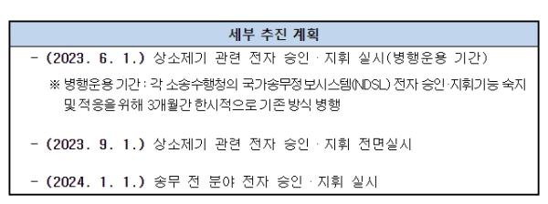 법무부는 전자승인·지휘체계의 원활한 이행과 정착을 위하여 2023. 4. 6일부터 5. 12일까지 총 6회의 전국 광역자치단체 권역별 순회 설명회 등을 실시했고, 5월 중 중앙행정기관 대상 추가 설명회 및 교육영상 배포 등을 실시할 예정이다.