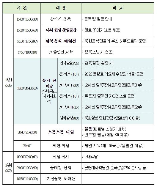 5.26일 첫째 날은 ‘통일텐트 꾸미기’와 ‘남북음식 나누기’ 및 ‘토크쇼’를 진행하고, 5.27일 둘째 날은 근현대사 박물관과 순국선열묘역 순례길 등 둘레길 산책 등의 일정으로 구성했다.