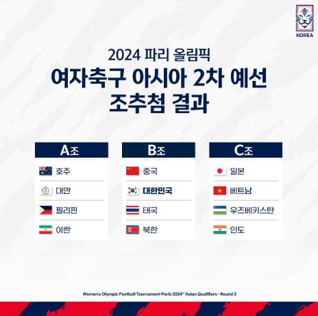 18일(한국시간) 말레이시아 쿠알라룸푸르의 아시아축구연맹(AFC) 하우스에서 2024 파리올림픽 여자축구 아시아지역 2차 예선 조추첨식이 열렸다. 한국은 가장 최근에 산정된 지난 3월 국제축구연맹(FIFA) 랭킹에 따라 호주(10위), 일본(11위), 중국(13위)에 이어 아시아에서 네 번째로 높은 17위를 기록해 2번 포트에 속했다. 추첨 결과 한국은 1번 포트의 중국, 3번 포트의 대만, 4번 포트의 북한과 만나게 됐다.
