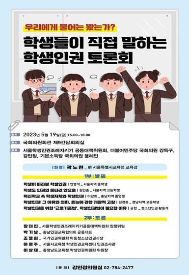 [한국뉴스타임=편집국] 더불어민주당 강민정, 강득구, 기본소득당 용혜인 의원은 서울학생인권조례지키기 공동대책위원회와 함께 2023년 5월 19일 15시 국회의원회관 제9간담회의실에서 ‘우리에게 물어는 봤는가? 학생들이 직접 말하는 학생인권’ 토론회를 개최한다.