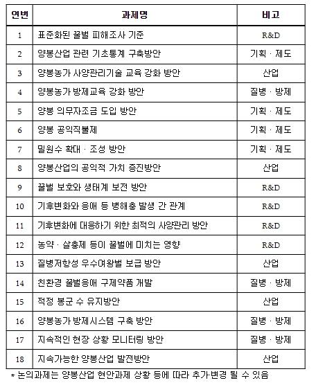 이번에 출범한 '지속가능한 양봉산업 협의체'에서는 기초통계 구축방안에 대한 논의부터 사육밀도관리, 밀원 수 확보 방안, 농약·살충제 등이 양봉에 미치는 영향, 양봉산업의 공익적 가치 증진방안 등 중장기 발전 방향과 연구개발 문제 등을 폭넓게 논의해 나갈 계획이다.
