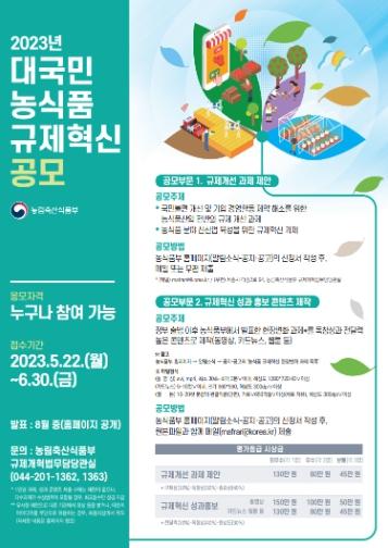 [한국뉴스타임=편집국] 농림축산식품부는 체감도 높은 현장 중심의 규제 발굴을 위해 5월 22일부터 6월 30일까지 6주간 ‘2023년 농식품 규제혁신 공모’를 실시한다.