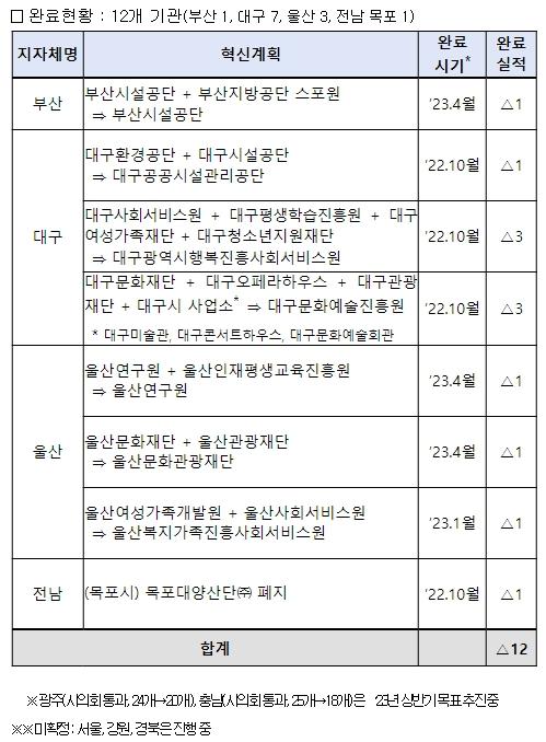 통폐합 대상이 된 12개 기관*은 지방 공사?공단과 지방 출자?출연기관으로 유사중복 기능을 갖고 있어 통합하여 운영하는 것이 효율적이라고 판단되는 기관 11곳을 통합하고, 설립목적을 달성하여 존속 시 안정적인 사업이 없다고 판단되는 목포대양산단㈜을 폐지했다.