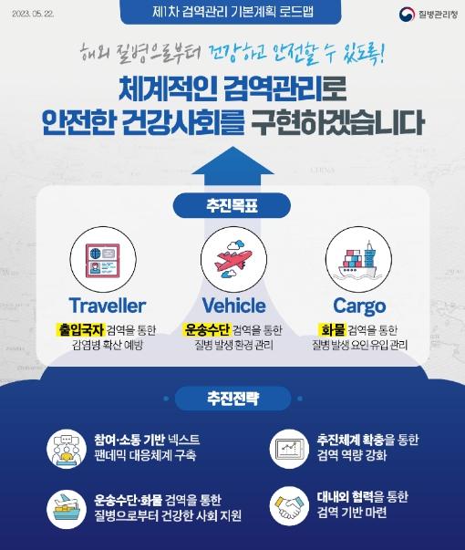 [한국뉴스타임=편집국] 질병관리청은 해외 질병으로부터 안전한 건강사회를 구현하기 위한 ?제1차 검역관리기본계획(‘23~’27)?을 검역전문위원회(5.15.)를 거쳐 확정했다고 밝혔다.
