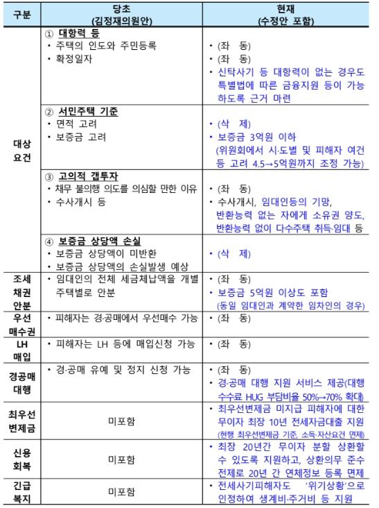 당초 임차주택의 면적(85㎡) 요건을 두었으나 삭제하였고, 보증금 3억원을 기준으로 하되, 전세사기피해지원위원회에서 최대 4.5억원 범위 내 조정 가능토록 했으나 이를 5억원으로 확대하였다.