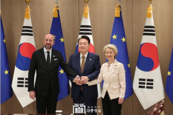 윤 대통령으 정상회담 후 공동언론발표를 통해 “한국과 유럽연합은 지난 60년간 정치, 경제, 글로벌 어젠다 등 모든 분야에서 협력을 발전시켜 왔다”면서 “오늘 한국과 유럽연합의 관계를 새롭게 확장해 나갈 협력 방안에 대해 논의했다“고 말했다.