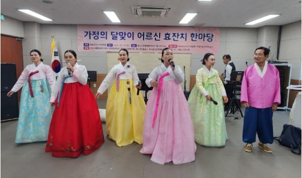 이날 행사는 주민자치센터 강사 양미자의 치매예방 웃음교실, 샘물소리음악봉사단의 식전 공연을 시작으로 한국열린문화예술협회의 2시간에 걸친 본공연이 이어져 어르신들께 큰 즐거움을 선사했으며, 청소년자치위원회 학생 30명이 신나는 트로트에 맞춰 재롱잔치를 펼치며 직접 제작한 ‘커피박 새활용 다육이 화분’을 제작 선물했다.