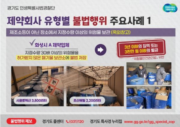 안산시에 위치한 C 제약업체는 허가받지 않은 폐기물 보관장소에 노말헵탄 등 지정수량 10.5배에 해당하는 제 4류 위험물을 저장하다, 안산시에 위치한 다른 D 제약업체는 폭발성 등 위험성이 높아 함께 저장해서는 안 되는 에탄올(제4류 위험물)과 유황, 철분(제2류 위험물)을 함께 저장하다 적발됐다.