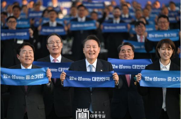 [한국뉴스타임=편집국] 윤석열 대통령은 5. 23일 오후 용산 대통령실 잔디마당에서 열린 ?2023 대한민국 중소기업인대회?에 참석해, 중소·벤처기업과 대기업이 함께 성장하는 생태계의 중요성과 스타트업, 기업인의 혁신·도전을 통한 경제적 가치 및 일자리 창출의 필요성을 역설하며, 정부가 공정하고 효율적인 시장 중심의 민간 주도 경제를 조성하기 위해 노력할 것이라고 밝혔다.