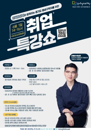 한편 이번 특강은 수원청소년문화센터 오프라인 진행과 동시에 ‘일자리센터’ 유튜브 채널을 통해 참여할 수 있으며, 현장 참여 희망자는 잡아바 어플라이를 통해 5월 29일 월요일까지 선착순 사전 접수 받을 예정이다.