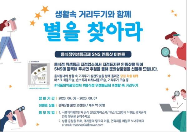 오산시(시장 곽상욱)는 음식점 위생등급제 인지도를 높이기 위해 식품의약품안전처에서 진행하는 ‘생활속 거리두기와 함께 음식점 별을 찾아라’이벤트를 오는 8월 7일까지 실시한다.