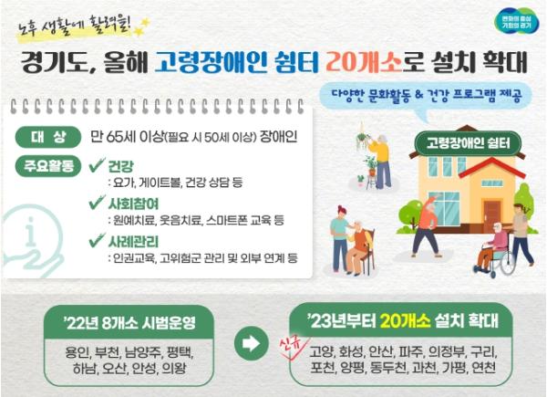 [한국뉴스타임=편집국] 경기도가 고령 장애인을 위해 문화 활동과 건강관리 프로그램 등을 제공하는 ‘고령 장애인 쉼터’ 20개소를 연내 설치·운영한다.